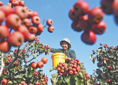 山東省淄博市沂源縣悅莊鎮(zhèn)崔家莊村,農(nóng)民在采摘山楂。 |